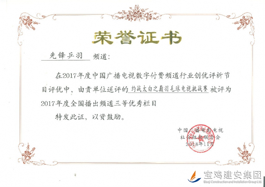 “約戰(zhàn)太白之巔”羽毛球電視挑戰(zhàn)賽被評為2017年度全國播出頻道三等優(yōu)秀欄目